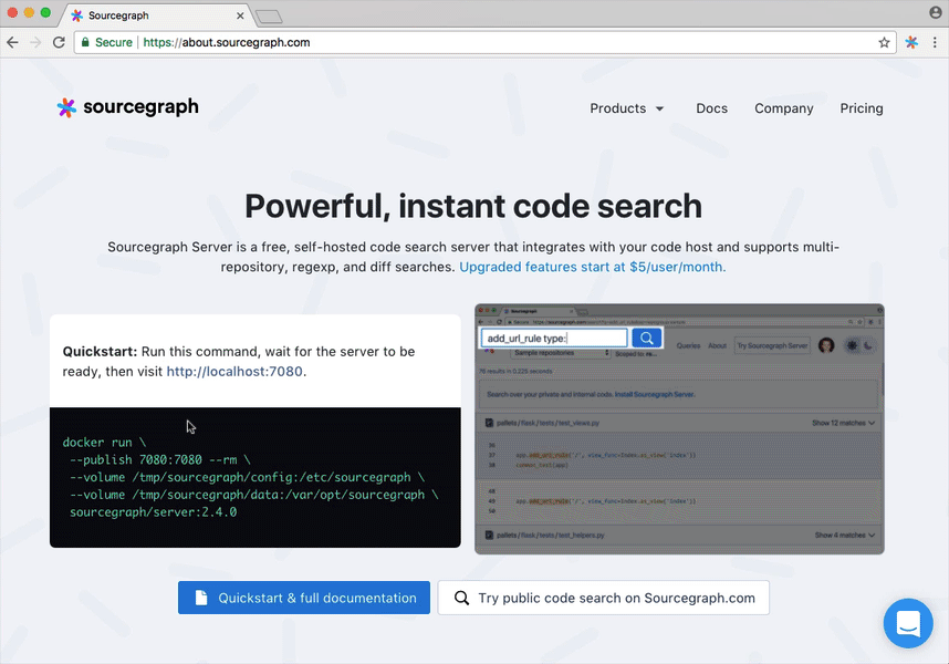 We've made it easier than ever to start searching your code with Sourcegraph Server: see the one-command docker run quickstart command.